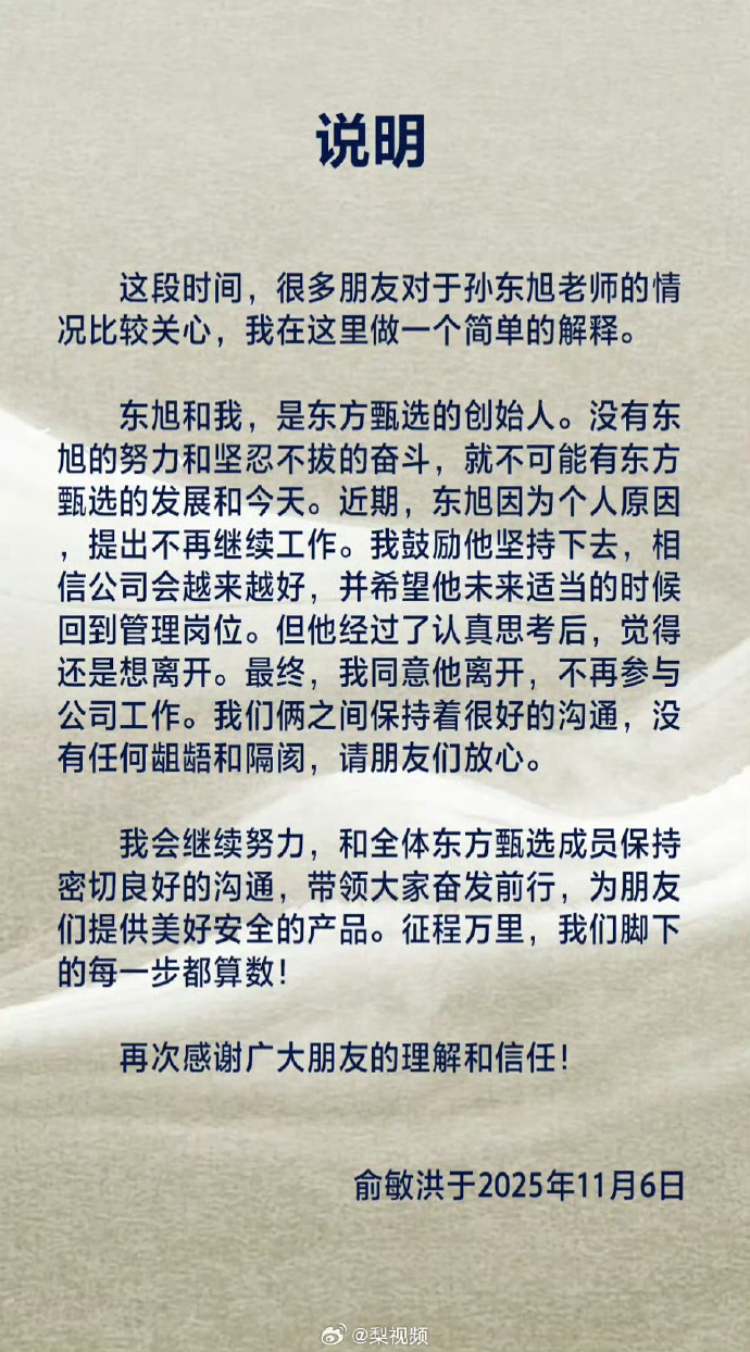 查看详情俞敏洪发文称:这段时间,很多朋友对于孙东旭老师的情况比较关心,我在这里做一个简单的解释。 东旭和我,是东方甄选的创始人。没有东旭的努力和坚忍不拔的奋斗,就不可能有东方甄选的发展和今天。近期,东旭因为个人原因,提出不再继续工作。我鼓励他坚持下去,相信公司会越来越好,并希望他未来适当的时候回到管理岗位。但他经过了认真思考后,觉得还是想离开。最终,我同意他离开,不再参与公司工作。我们俩之间保持着很好的沟通,没有任何龃龉和隔阂,请朋友们放心。 我会继续努力,和全体东方甄选成员保持密切良好的沟通,带领大家奋发前行,为朋友们提供美好安全的产品。